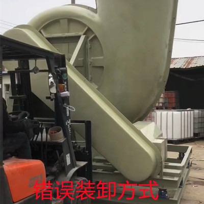 a、玻璃鋼風(fēng)機(jī)除了風(fēng)機(jī)架子、電動(dòng)機(jī)、軸承箱等配件外,其它的配件都是玻璃鋼材料制作的,無(wú)論是硬度還是抗壓能力都要弱一些,在裝卸過(guò)程中使用不合理的方式很可能會(huì)導(dǎo)致配件損壞。比如上圖中使用叉車(chē)裝卸風(fēng)機(jī)的方式就是錯(cuò)誤的,因?yàn)椴孳?chē)的護(hù)板正對(duì)著皮帶保護(hù)罩,稍有不能就可能導(dǎo)致皮帶罩與護(hù)板撞擊而受到損壞。